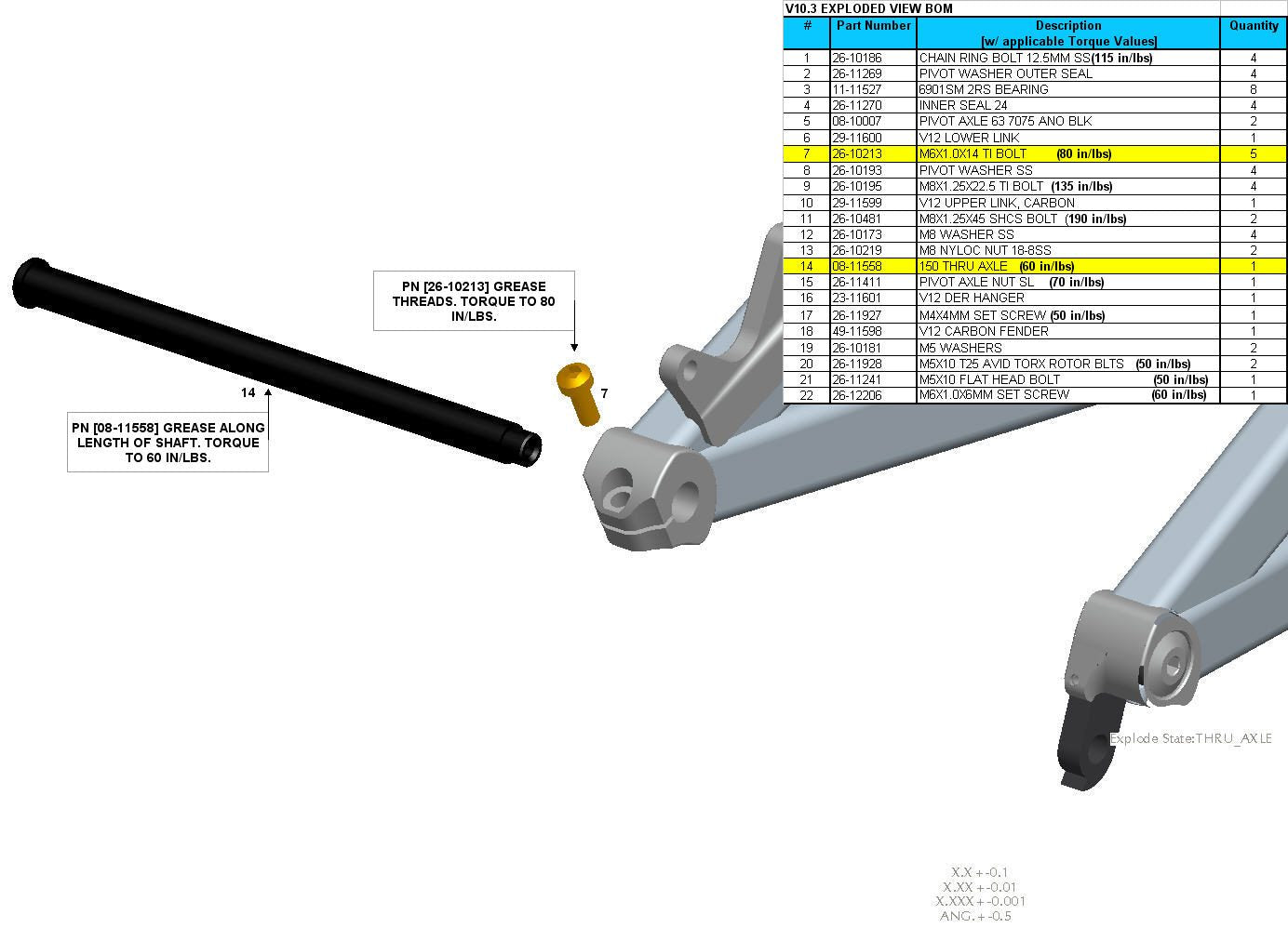 Thru-Axle Pinch Bolt M6 x 1 x 14 domed socket head cap screw Grease 80 inch lbs -