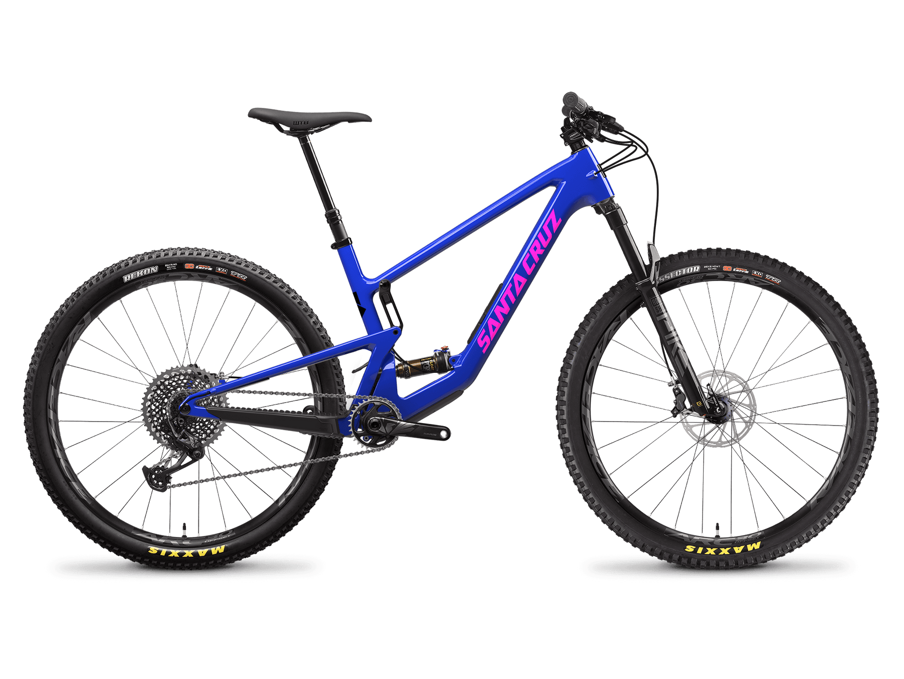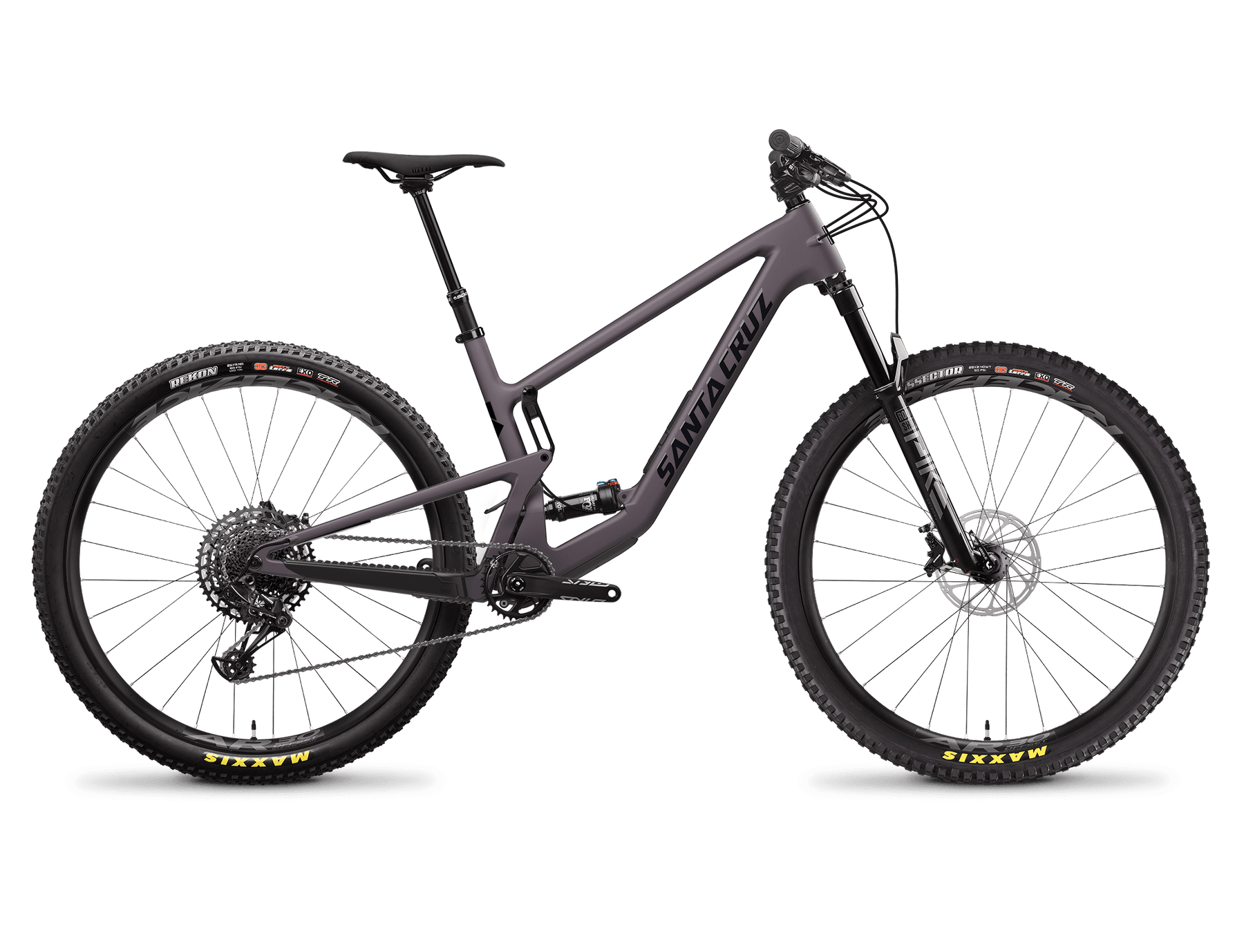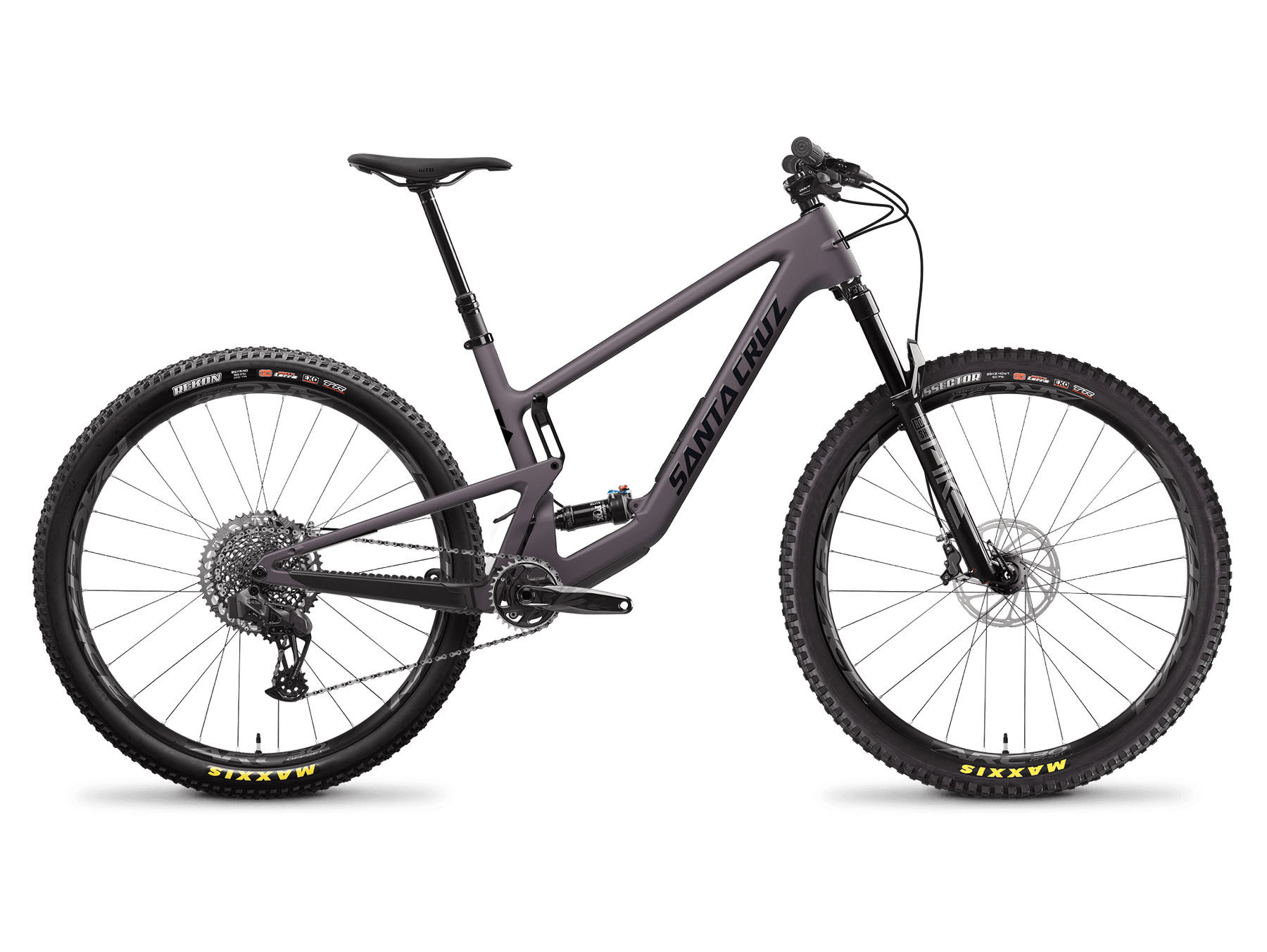 Cadre carbone CC, transmission électronique SRAM X0 T-Type, freins SRAM 4 pistons et suspensions haut de gamme, roues en carbone Reserve devenues référence.