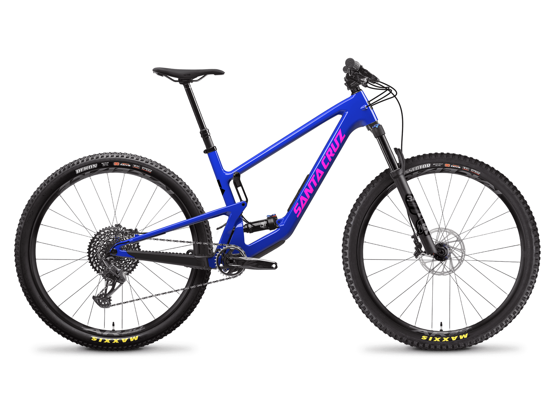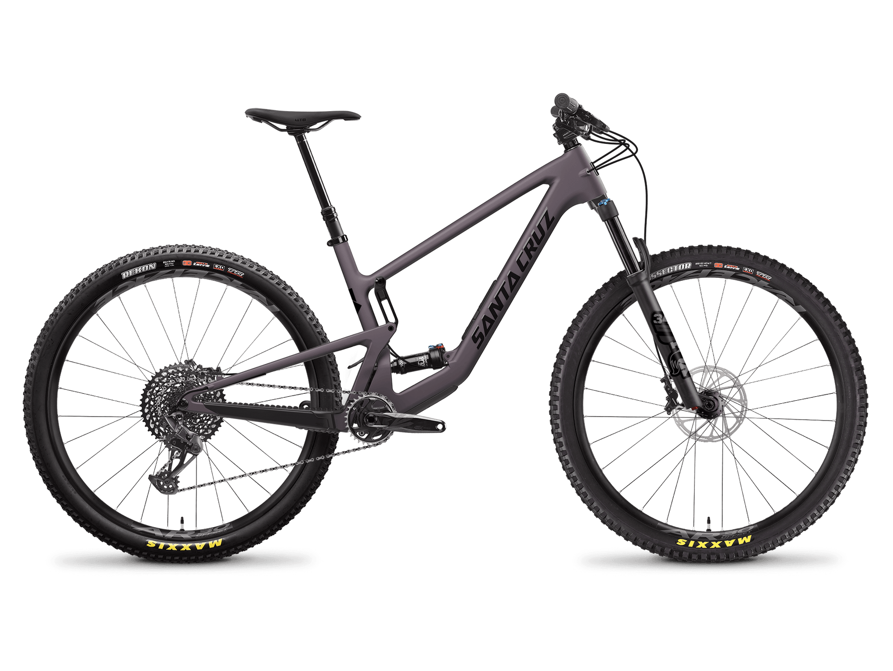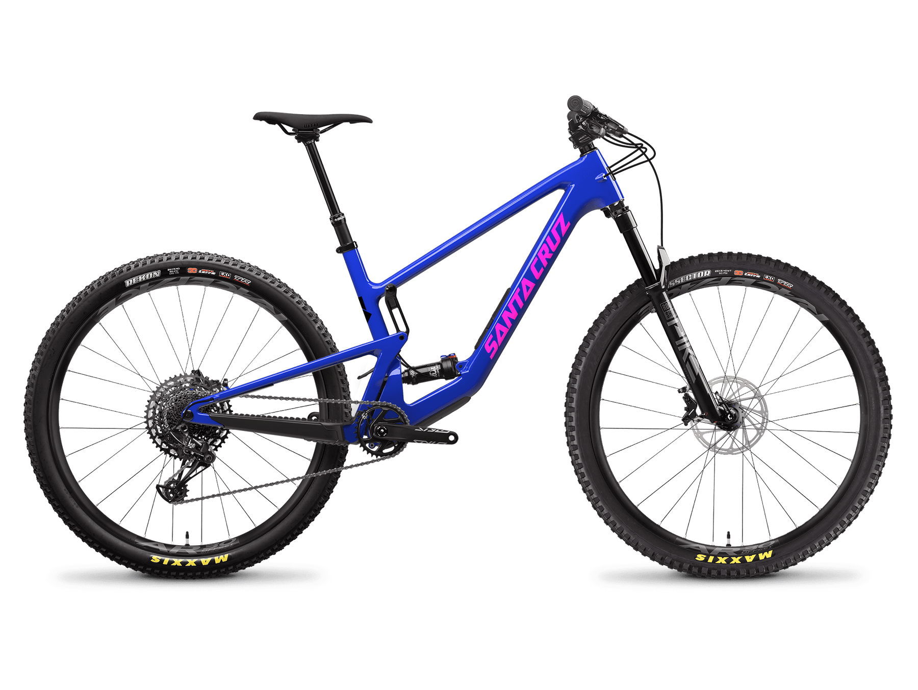 Cadre carbone CC, transmission électronique SRAM X0 T-Type, freins SRAM 4 pistons et suspensions haut de gamme, roues en carbone Reserve devenues référence.