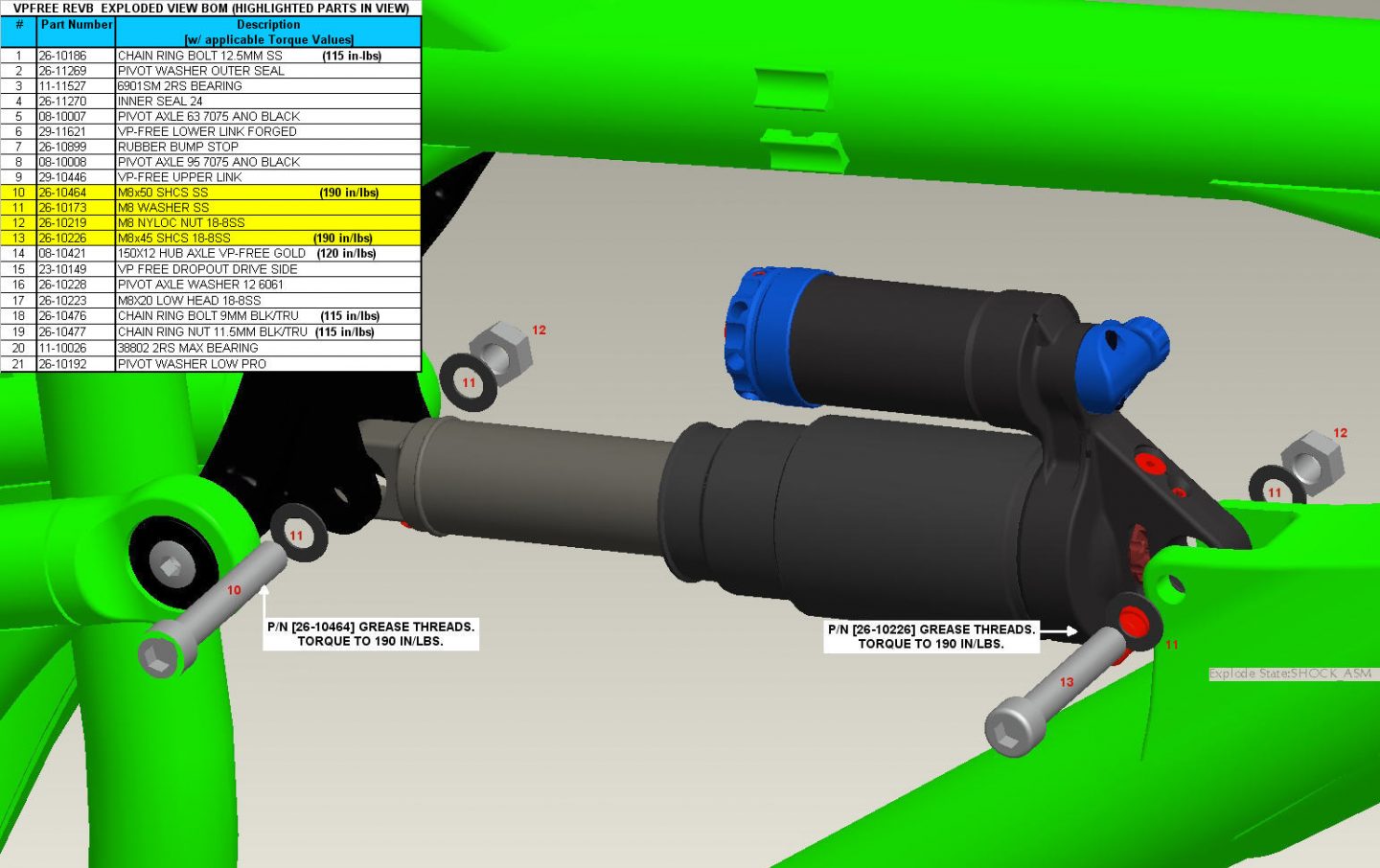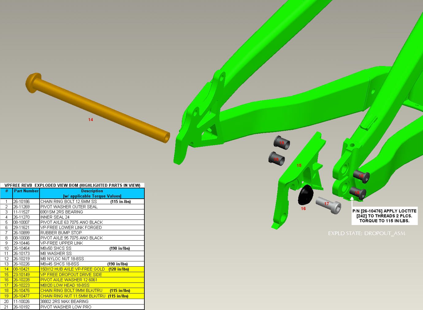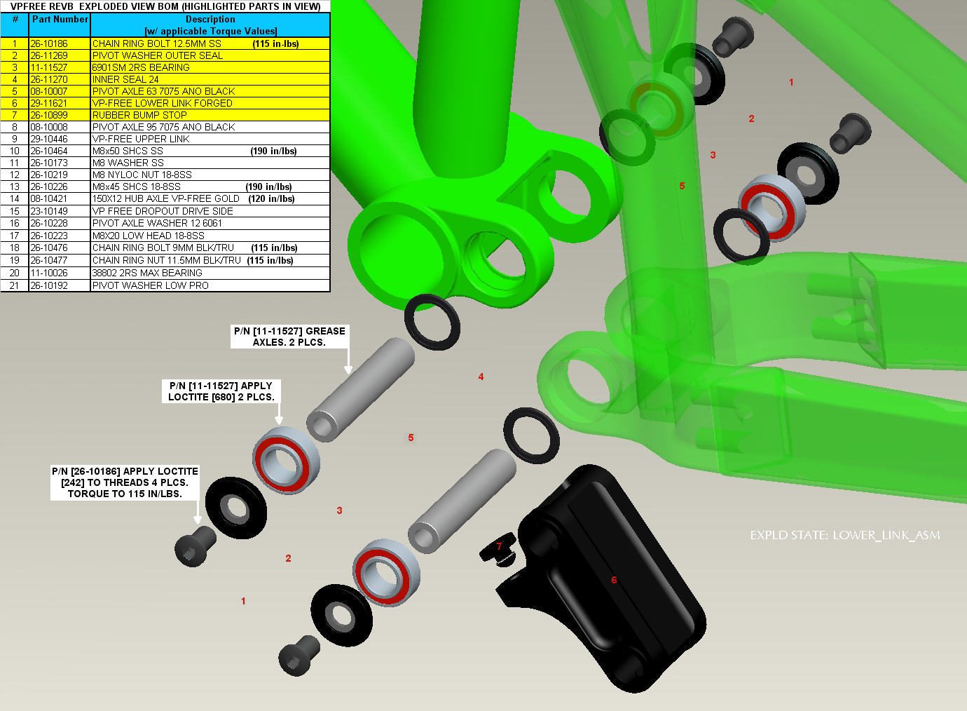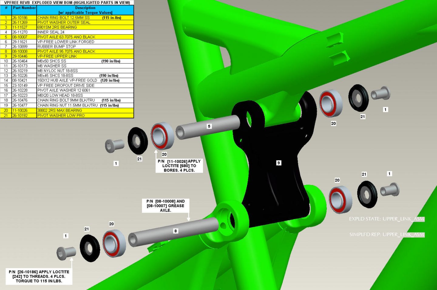 | Upper Link Bolts | Upper Pivot Chainring Bolts (4) | Loctite 242 | 115 inch lbs | - |